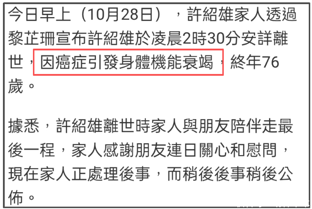 据悉,许绍雄在凌分安详离世,因癌症引发身体机能衰竭,享岁。在离世最后,家人和朋友陪伴他走过这一程,家人感谢亲朋好友连日的宽慰,正在忙着处理后事,稍后家人也会对外公布消息。